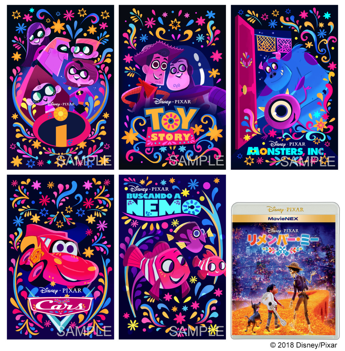『Mr.インクレディブル』、『トイ・ストーリー』、『モンスターズ・インク』、『カーズ』、『ファインディング・ニモ』の人気キャラクターたちが、まるで『リメンバー・ミー』MovieNEXの発売をお祝いするかのような笑顔で描かれた、ディズニー/ピクサーのクリエイターたちの遊び心がつまったかわいい特別アートに仕上がっています☆