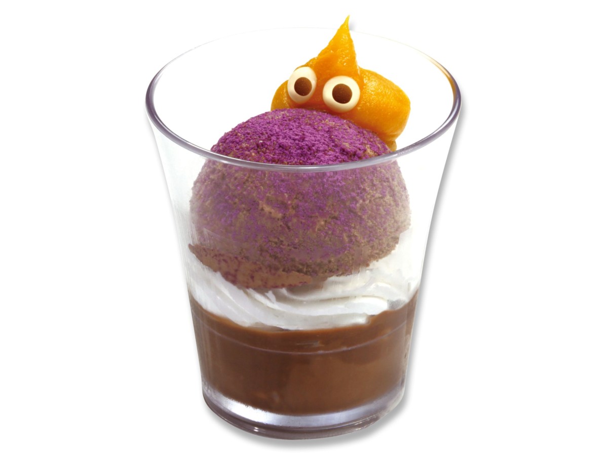 チョコプリン、ホイップクリーム、そしてチョコレートアイスの上に紫イモパウダーをまぶし、特製のカボチャ餡とホワイトチョコで作られた目玉をトッピング。