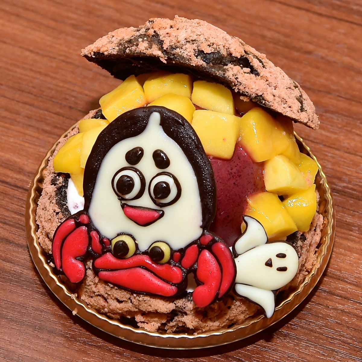 ナンジャタウンの「もののけ番外地」にいるキャラクター「能面蟹」をモチーフにしたシュークリーム。