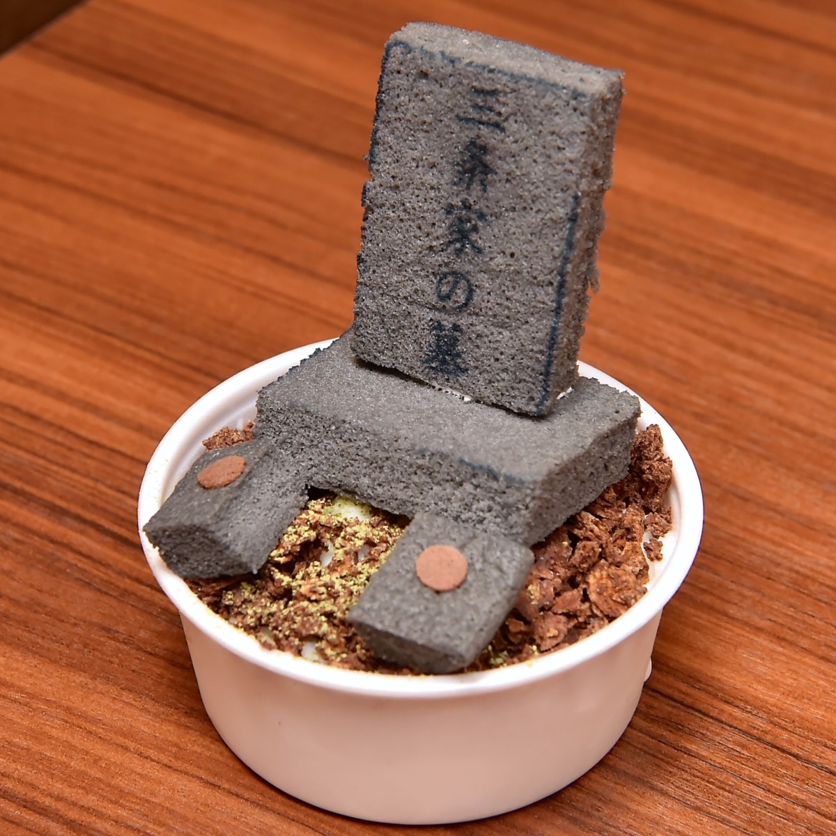 土の下にはチョコレートで作られたガイコツが埋まっている、ユニークなデザートです。