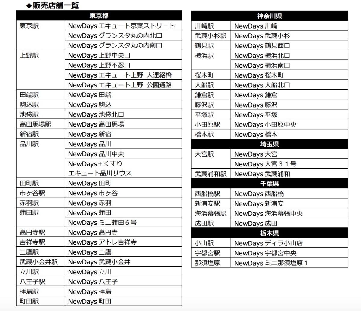 販売店舗:東京・神奈川・埼玉・千葉・栃木エリア「NewDays」50 店舗(下の表参照)
