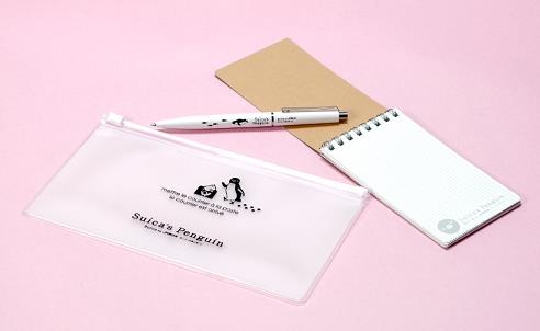 スタイリッシュなエトランジェのボールペンとメモ帳、ジッパーケースに Suica のペンギンのデザインが入った限定文具セットです。