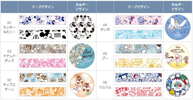 デザインは「ミッキー&ミニー」「ドナルドダック」「チップとデール」「ダンボ」「プー」「ツムツム」の全6種類がラインナップ。