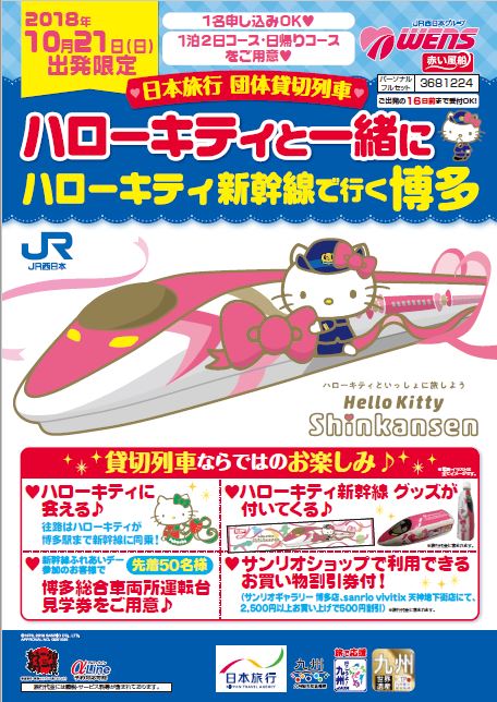 日本旅行の国内パッケージツアーブランド「赤い風船」から、「ハローキティ新幹線」の団体臨時列車を利用した「ハローキティ新幹線で行く博多」プランが登場!