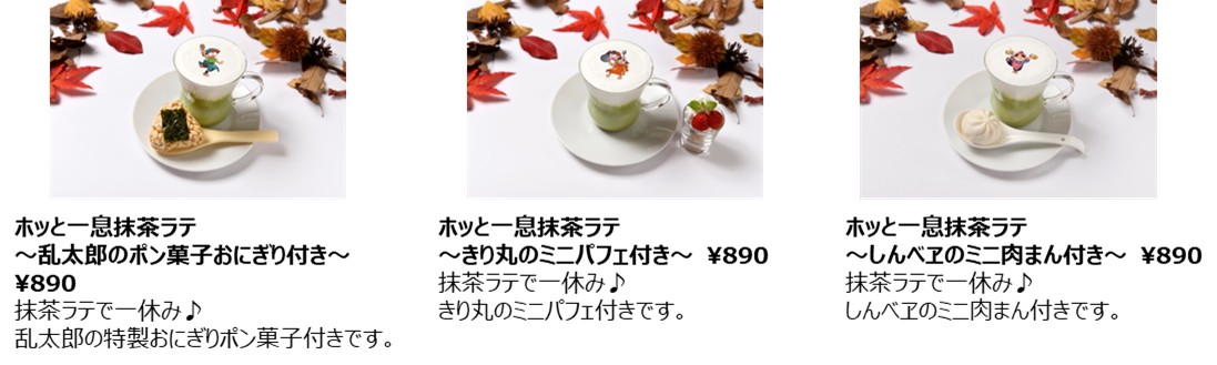 ホッと一息抹茶ラテ 〜乱太郎のポン菓子おにぎり付き〜/ホッと一息抹茶ラテ 〜きり丸のミニパフェ付き〜/ホッと一息抹茶ラテ 〜しんべヱのミニ肉まん付き〜