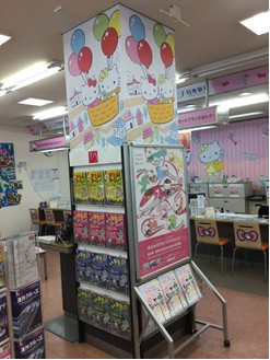 南側自動扉や中央柱、椅子やテーブルにいたるまで、キュートなハローキティ一色!