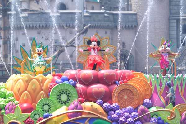 ドナルドダックたちが、フロート上から水しぶきをあげながら、活気と遊び心にあふれた楽しい演舞を披露。