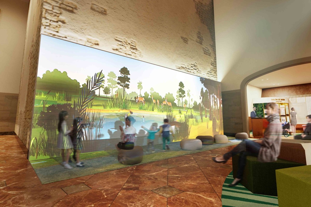 "プレイフルフォレスト(遊び心あふれる森)"をテーマとしたロビーの壁面に、参加して体験できる空間が造りだされます。