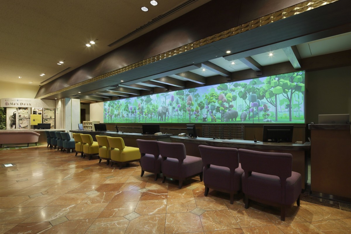 今回のリニューアルの目玉となるプロジェクションマッピングが新設されるのは、ロビー壁面(横約8.5メートル・縦約3メートル)と床面、そしてフロントカウンター背面(横約11メートル)の2ヶ所。