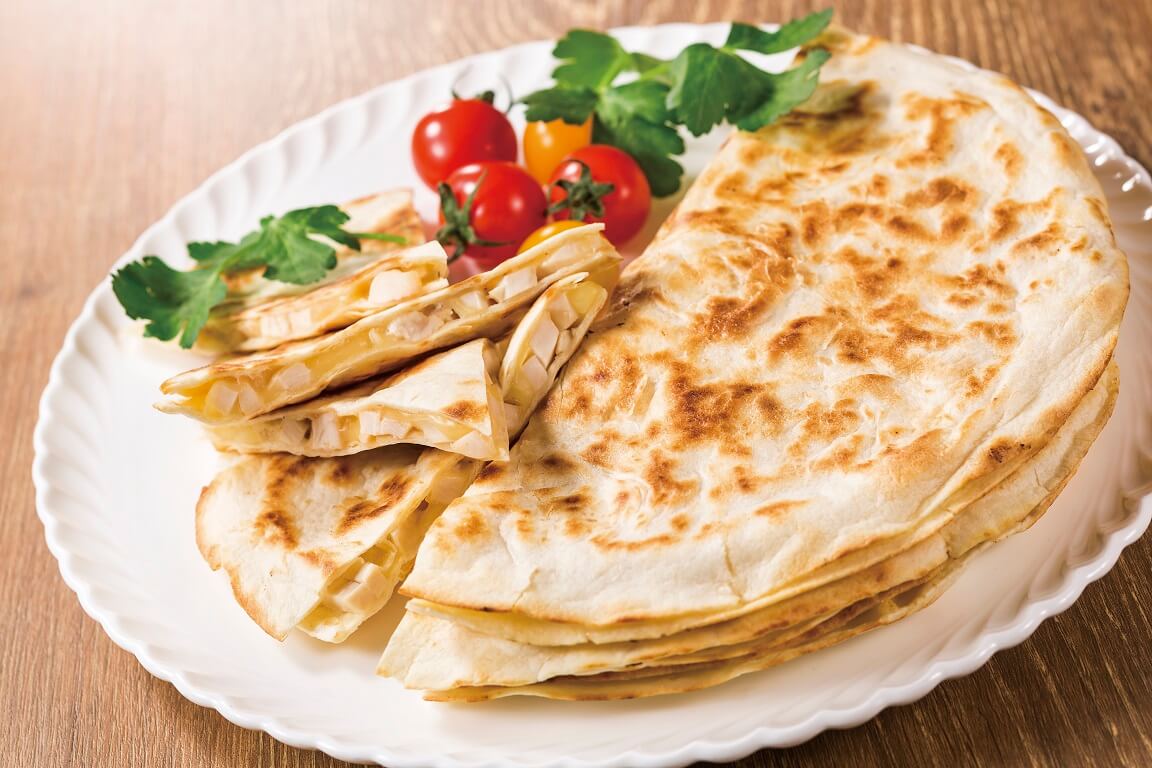 トルティーヤにチーズとチキンをサンドして、香ばしく焼いたメキシコの定番料理。