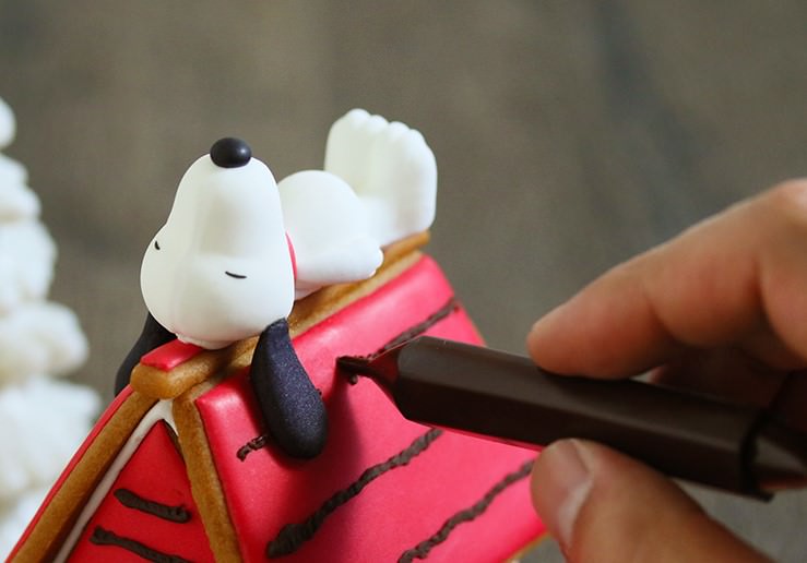 スヌーピーのドッグハウスをイメージした赤いクッキーを組み立ててチョコペンで模様を描き、スヌーピーをのせれば完成です。