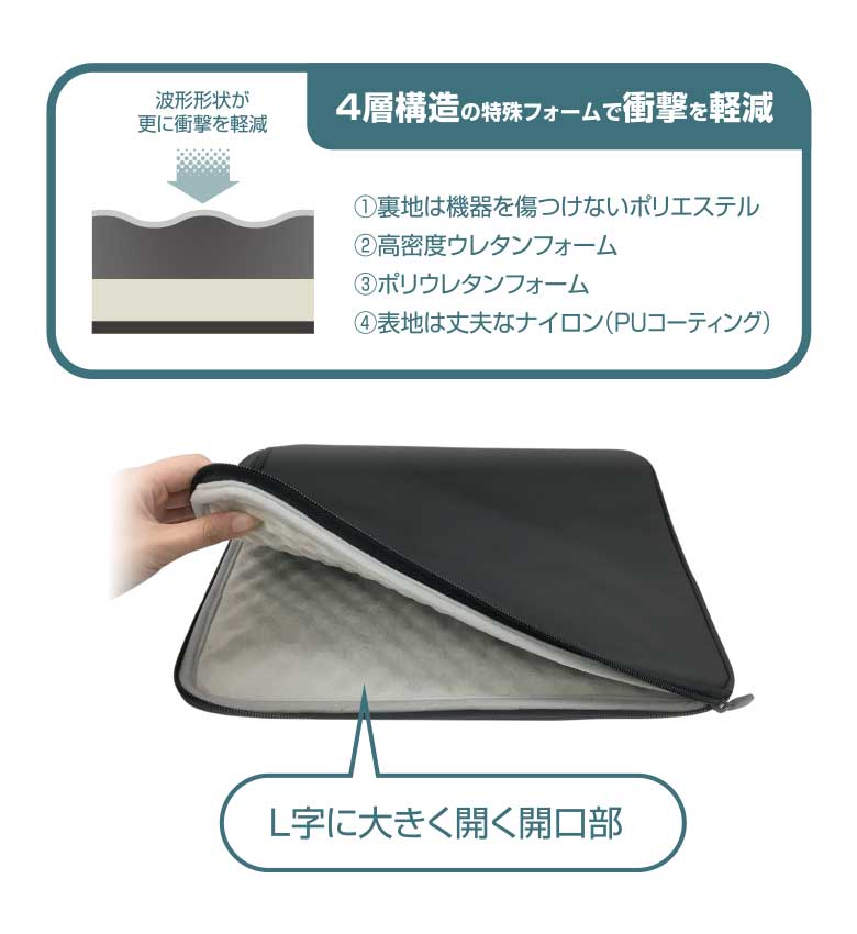 4層構造の特殊フォームで機器への衝撃を軽減するPC・タブレット用インナーケースです。
