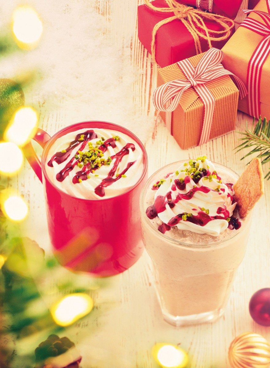写真右の「チョコチップモカフローズン カシス」は、チョコチップ入りのコーヒーベースのフローズンドリンクに甘酸っぱいカシスソース、そしてホイップクリーム、ピスタチオ、パイをのせた贅沢なドリンクに仕上がっています。