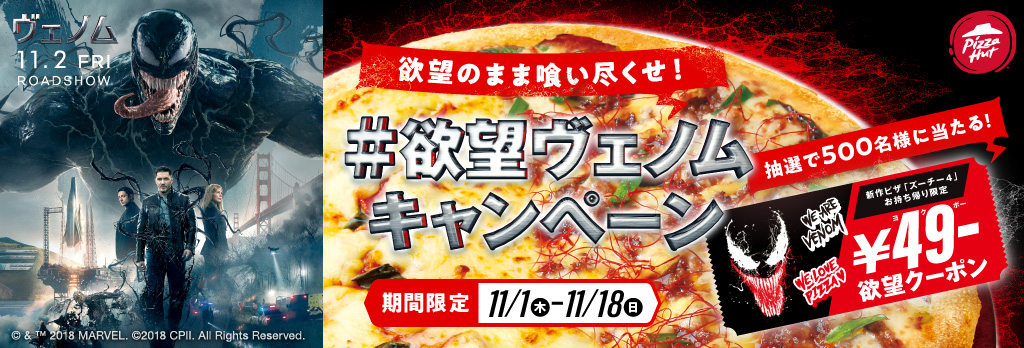ピザハットでは、2018年11月2日(金)より公開される映画『ヴェノム』とコラボレーションした「欲望のまま喰い尽くせ!#欲望ヴェノムキャンペーン」を期間限定で実施。
