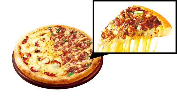ピザハットで人気No.1の「特うまプルコギ」と「プレミアム・マルゲリータ」のハーフ&ハーフに、トッピングである「プルコギ」と「フレッシュモッツァレラ」をそれぞれたっぷりと増量した「ヴェノム」認定の「欲望マシマシピザ」