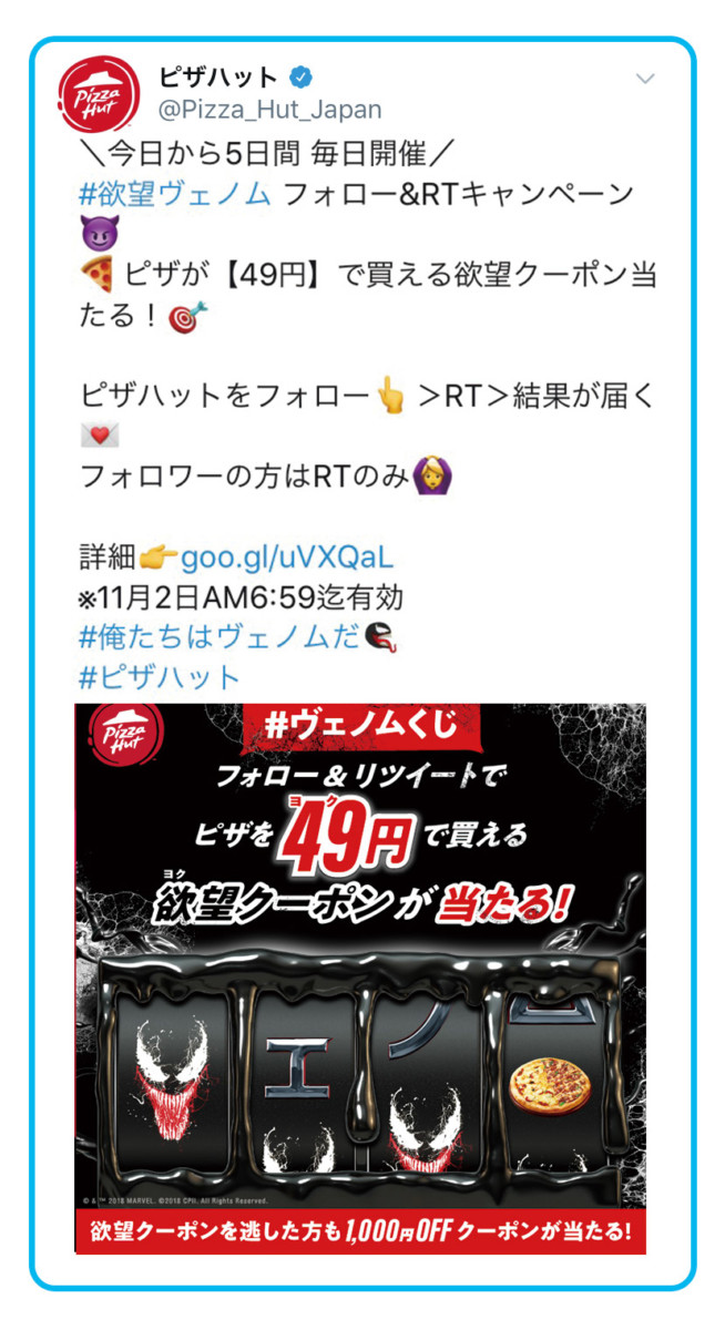ピザハット公式Twitterをフォロー&リツイートで「ヴェノムくじ」に挑戦できるキャンペーンを実施。