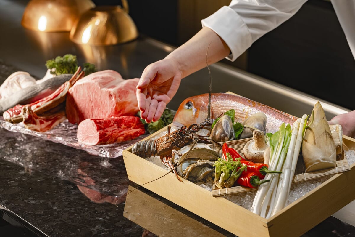 鉄板割烹「山吹」では料理長自らが目利きした、四季折々の厳選食材を、ゲストの好みに合わせて調理。