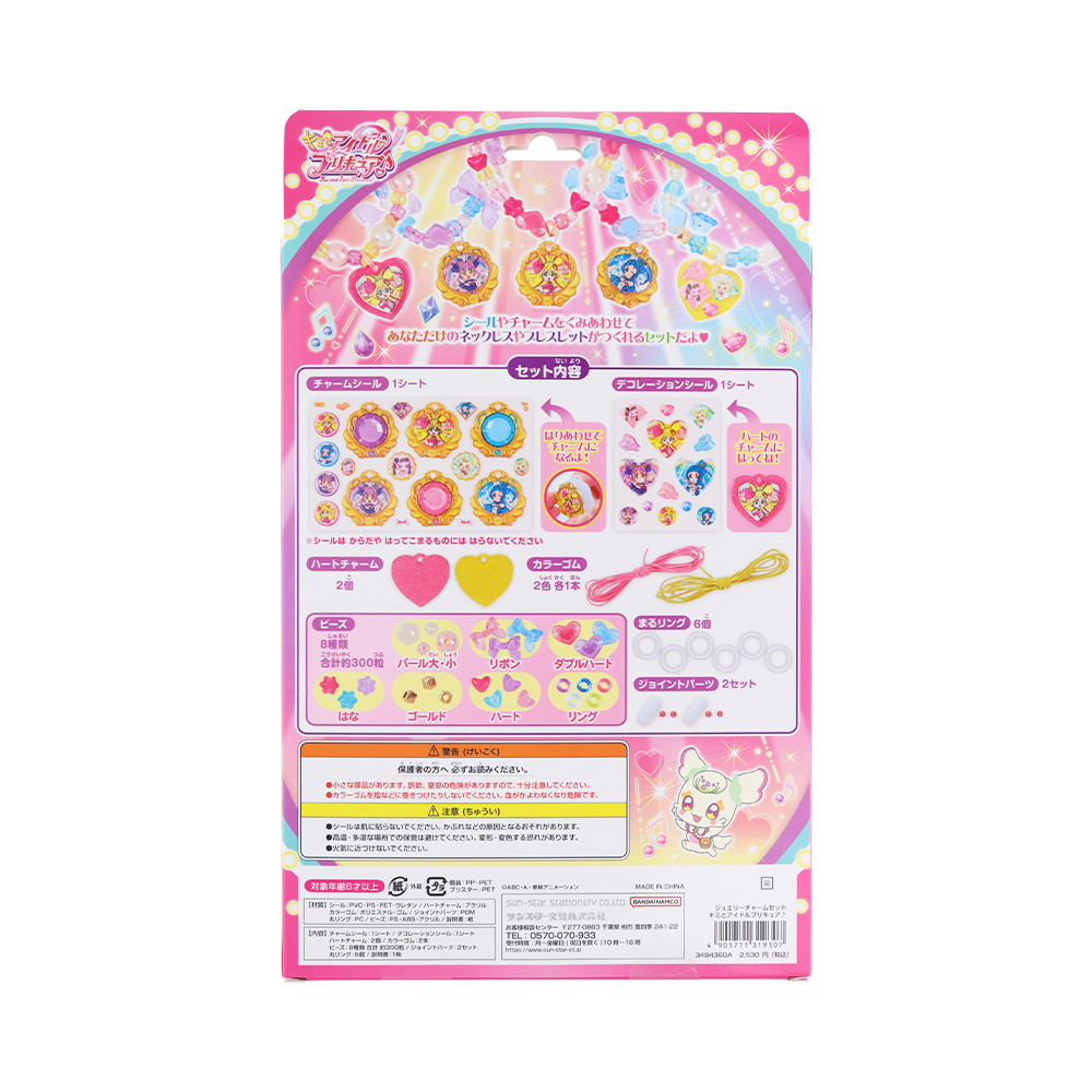 セット内容:チャームシール 1シート/デコレーションシール 1シート/ハートチャーム 2個/カラーゴム 2本/ビーズ 8種類 合計 約300粒/ジョイントパーツ 2セット/丸リング 6個/説明書 1枚