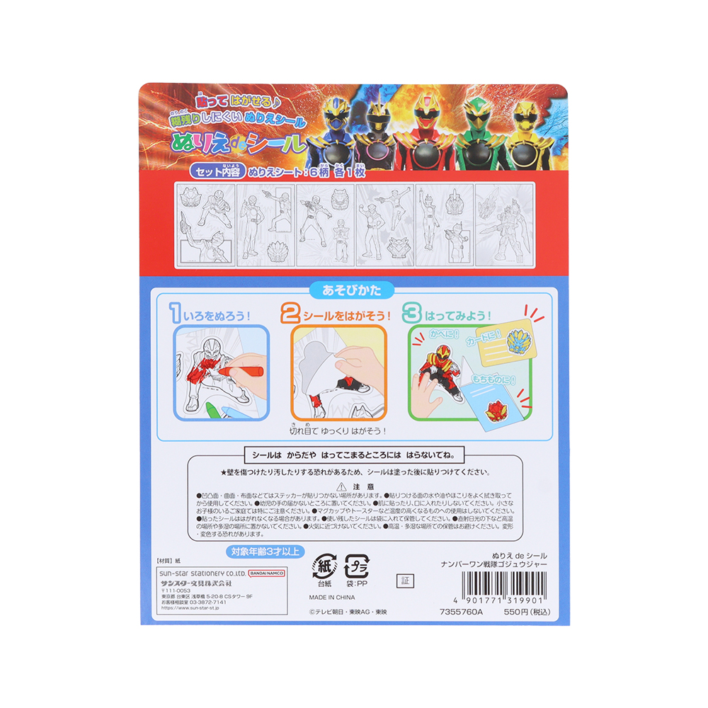 日曜朝9時30分より放送中の『ナンバーワン戦隊ゴジュウジャー』が、サンスター文具の「ぬりえdeシール」に登場。