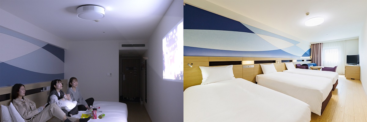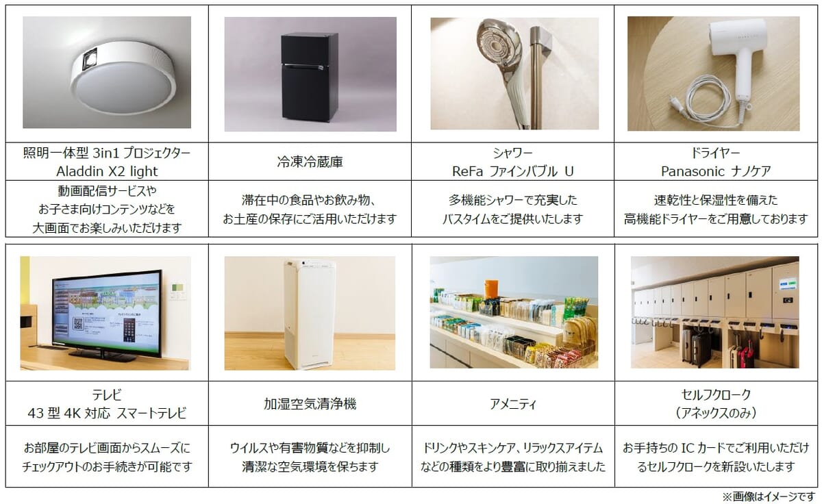 今回、新たに動画配信サービスやお子さん向けコンテンツなどが楽しめるプロジェクターと、冷凍冷蔵庫を全客室に導入。