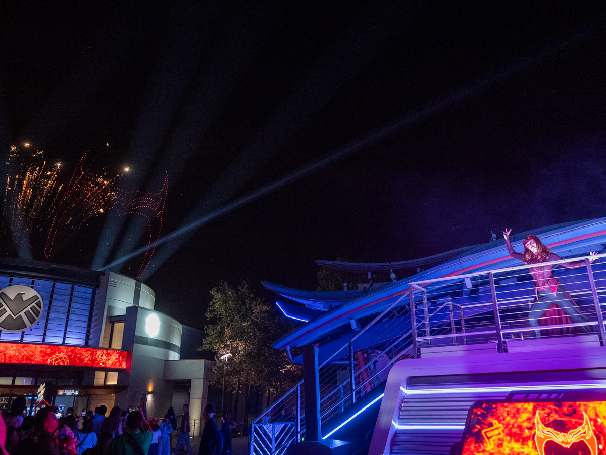 「スカーレット・ウィッチ」のカオスマジックがスターク・エキスポを包み込み、圧巻の演出がトゥモローランド全体を彩ります☆