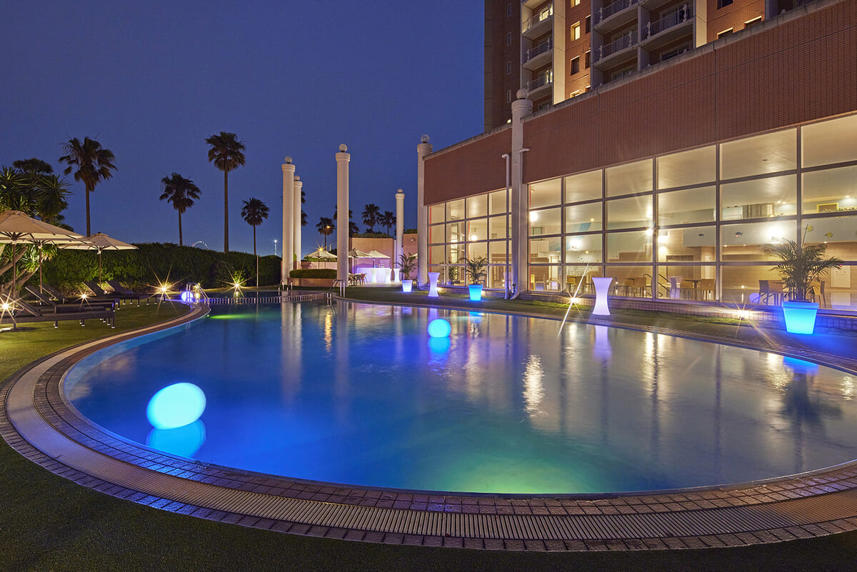 刻々と移り変わる夕景の中、ライトアップされていく幻想的なナイトプールが楽しめます。