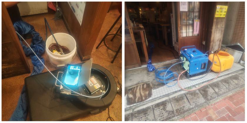 カメラで調査をすると固形化した油が見つかったため、高圧洗浄機で除去。