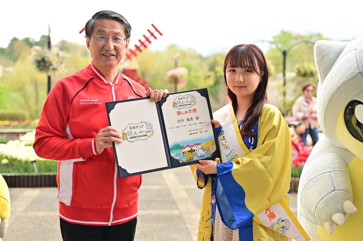 鳥取県出身の声優・田中苑希さんを招き、「鳥取サンド巡ルート2025楽しみ大使」に任命する委嘱式を2025年4月20日に開催。