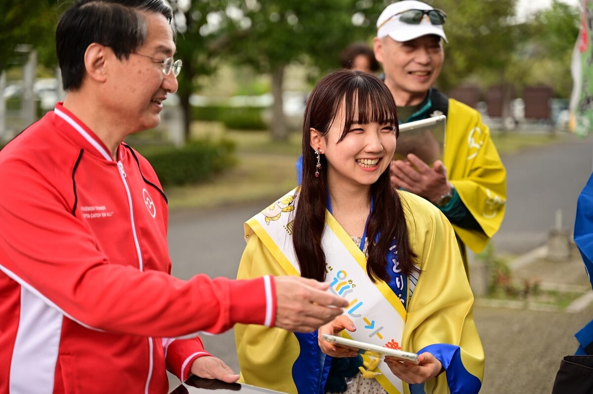 委嘱式にて、平井知事から委嘱状とタスキを手渡された田中苑希さん。