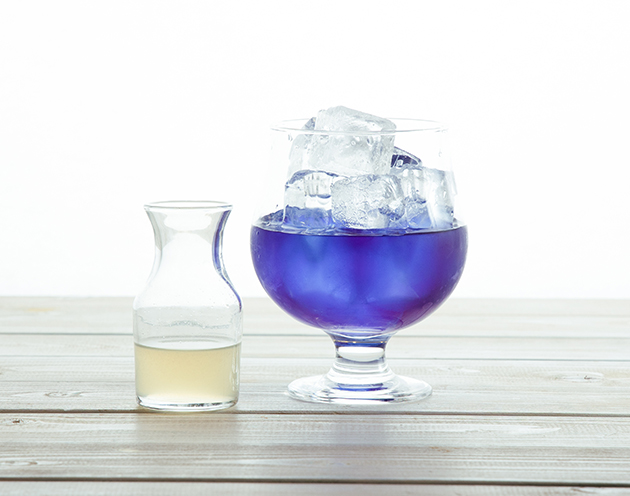 海のようなコバルトブルーですが、レモンシロップを入れることで紫のようなカラーに変化します。