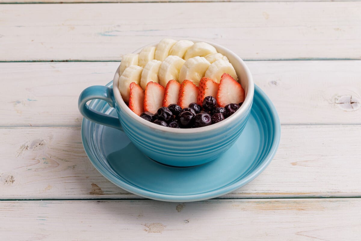 3枚重ねたパンケーキ生地の上には、アサイーとヨーグルトを組み合わせた特製のクリームがボリューミーに重なり、いちご・バナナなどのフレッシュフルーツをトッピング。