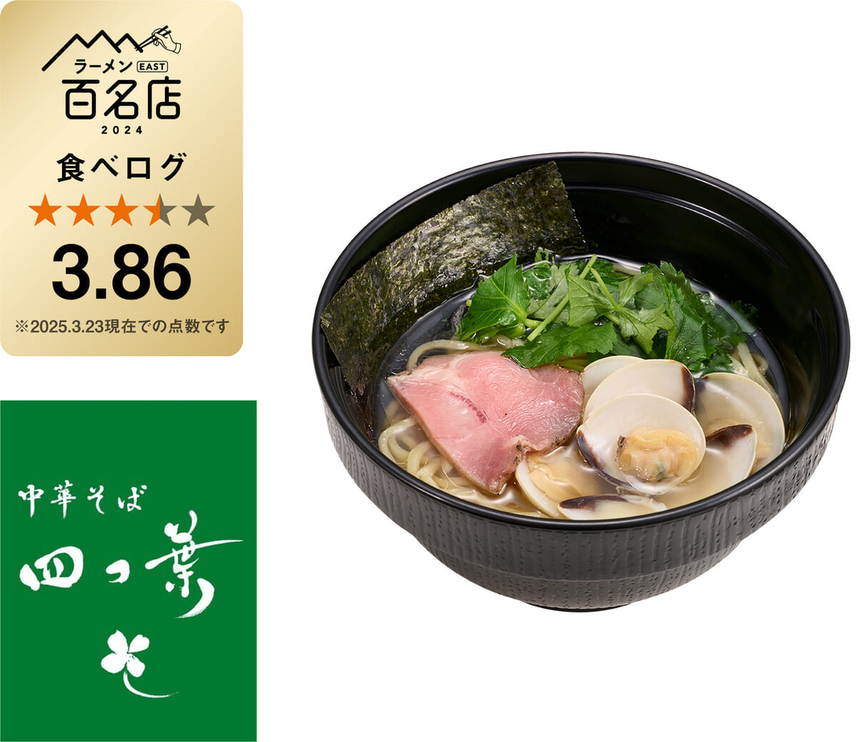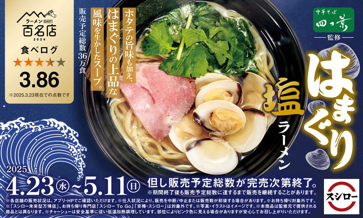 「スシロー×食べログ」全国名店監修シリーズに、埼玉の人気ラーメン店“中華そば 四つ葉”が監修した「はまぐり塩ラーメン」が期間限定で登場します!
