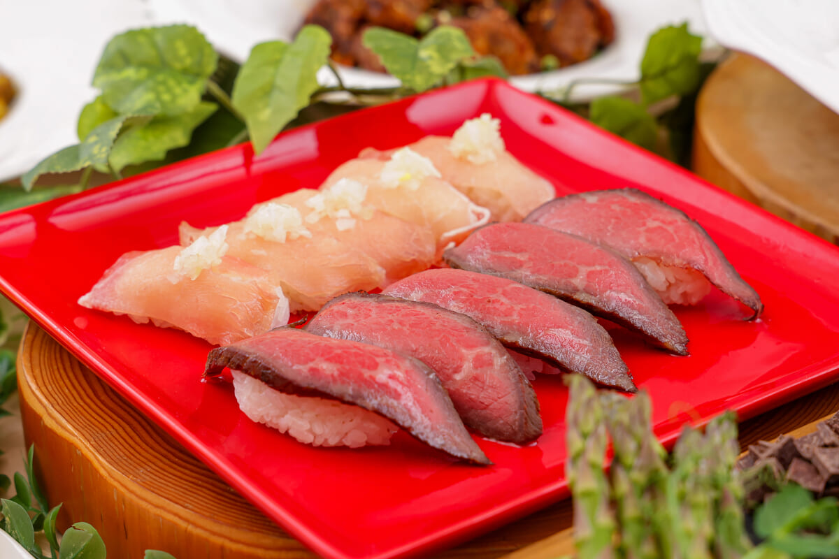 さらに、ココア塩で味わう天ぷらや、ローストビーフ・生ハムの握り寿司など、肉の魅力を多彩なスタイルで展開。