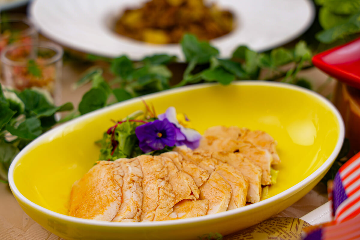 「よだれ鶏」のソースにもカカオを加え、奥行きのある味わいに。