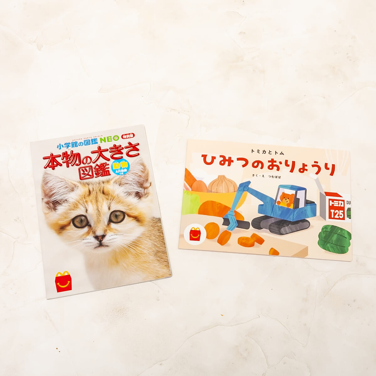 マクドナルド「ほんのハッピーセット」絵本「トミカとトム ひみつのおりょうり」/ミニ図鑑「小学館の図鑑NEO 特別版 本物の大きさ図鑑」