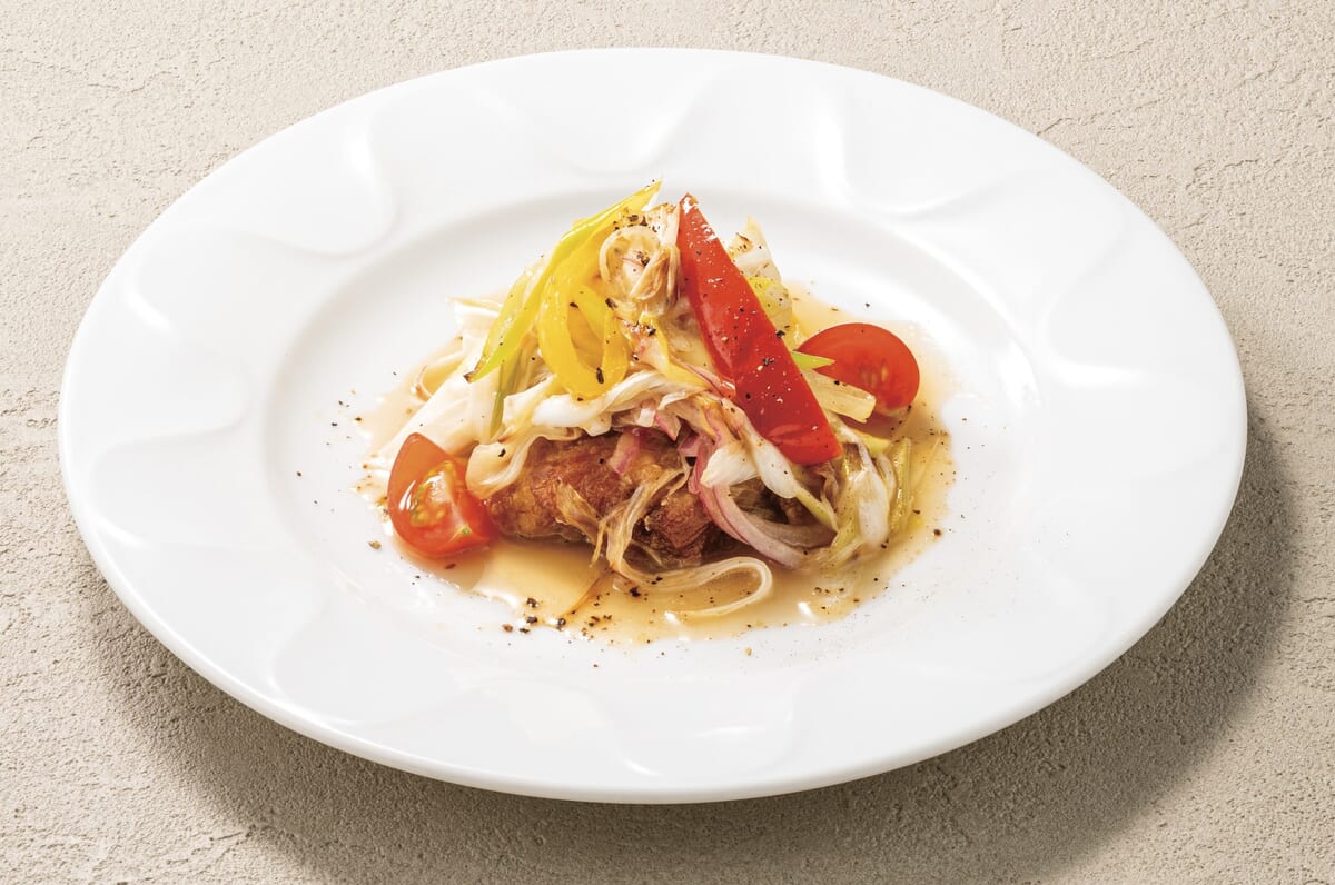 赤玉ねぎやパプリカ、ミニトマトなど鮮やかな野菜が彩りだけでなく食感・味のアクセントになります。