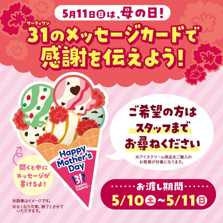 5月10日(土)~11日(日)は、店頭にて、アイスクリームを購入時に希望すると、母の日メッセージカードを数量限定で付けてくれます。