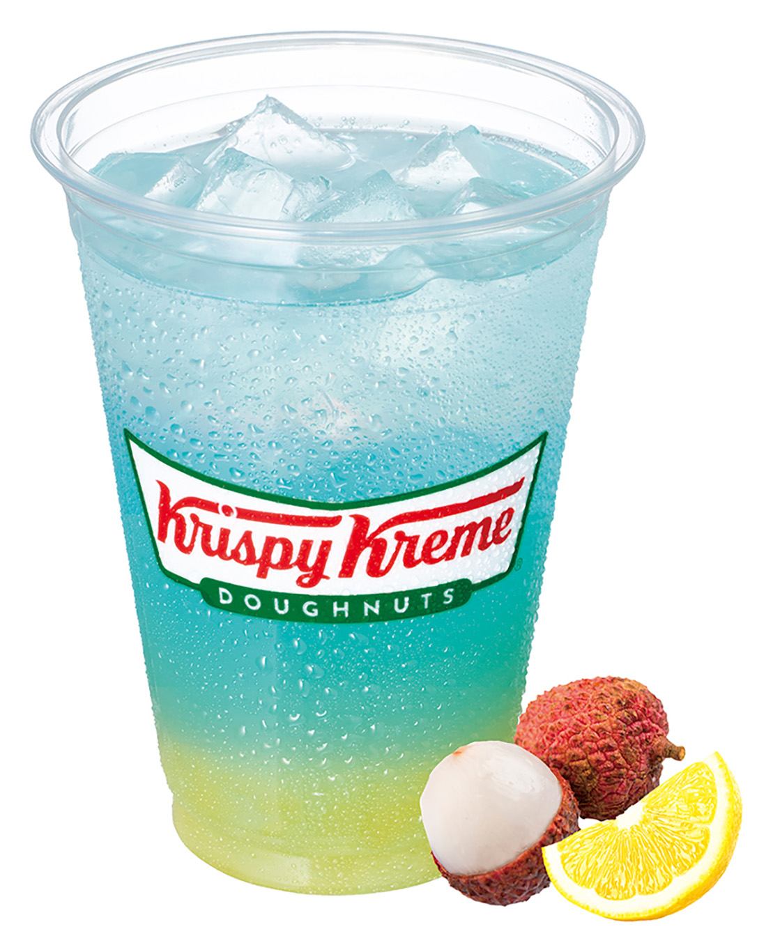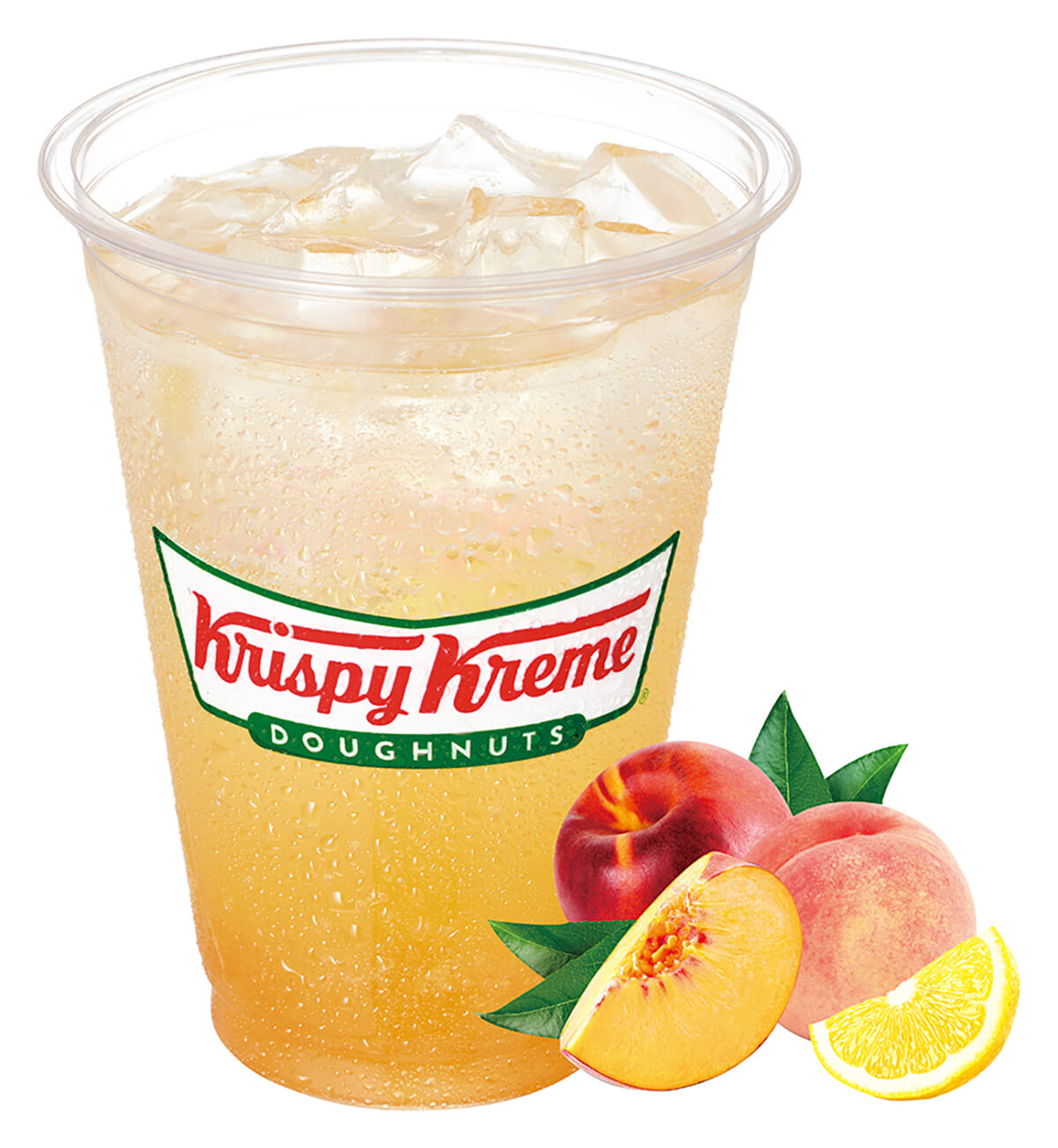 レモン果汁に果肉、果皮も加えたクリスピー・クリーム・ドーナツオリジナルのレモネードソーダをベースに、みずみずしい甘さのライチシロップと口の中でチュルンと弾ける白桃ジェリーが加えられています。