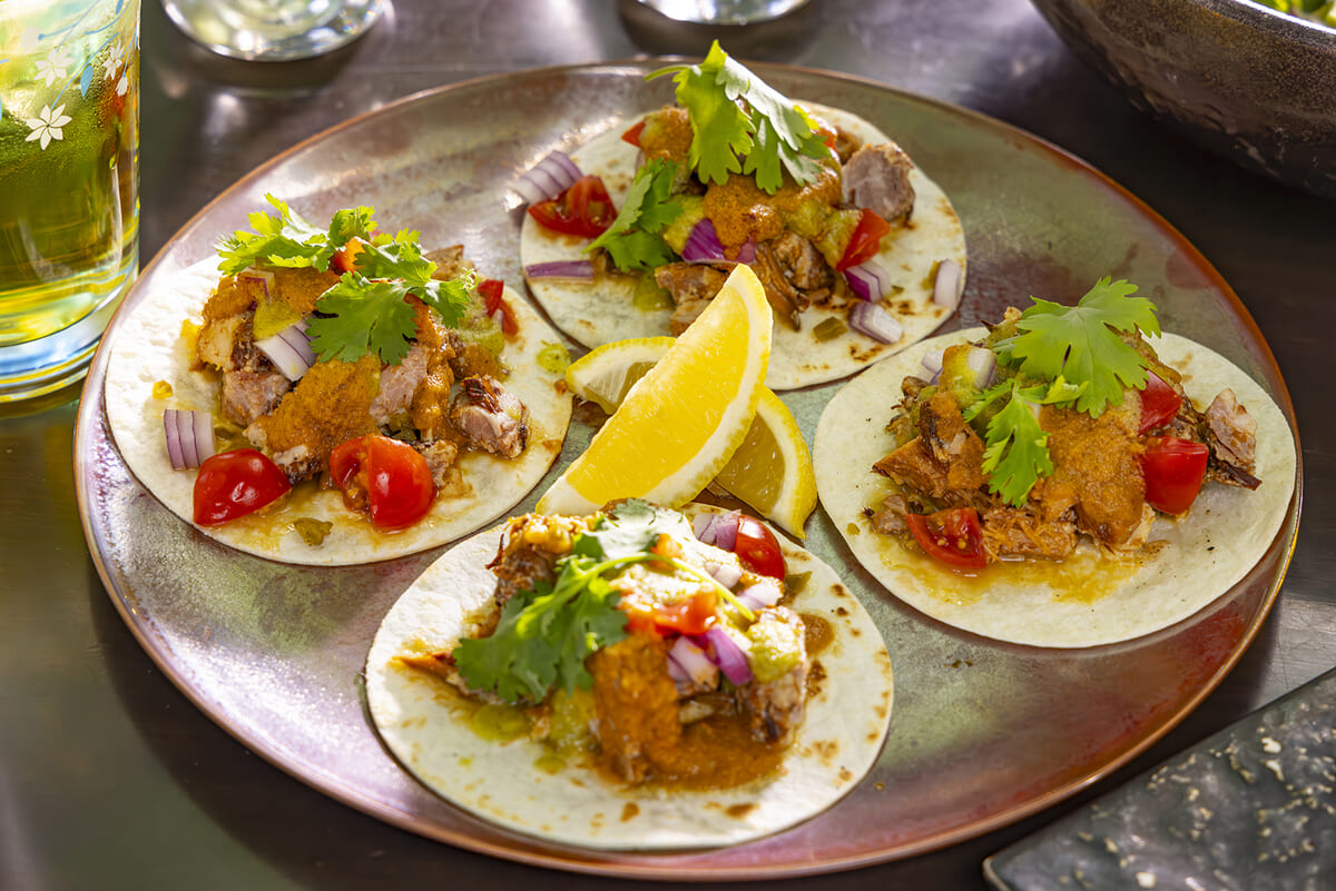 「TERRACE de TACOS」で提供する「タコス・カルニータス」は、トルティーヤにほろりと崩れる豚肉をたっぷりとのせた王道のタコス。