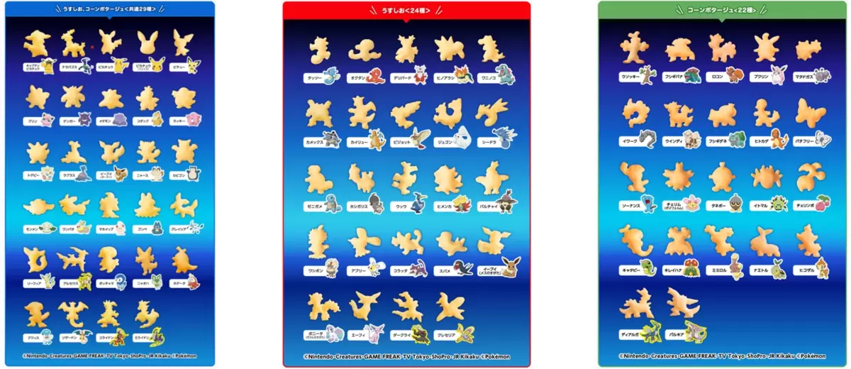 うすしお味とコーンポタージュ味に共通でアソートされるのは29種、うすしお味限定は24種、コーンポタージュ味限定は22種がランダムで入っています!