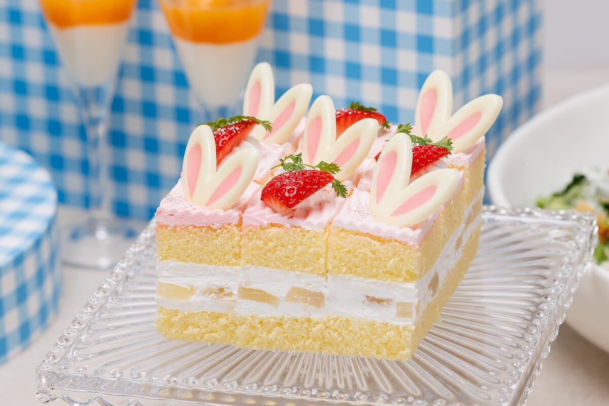 「北海道産ヨーグルトと桃のウサ耳ショート」は、ヨーグルト生クリームに桃のコンポートをサンドした、夏らしいさっぱり味のショートケーキ。