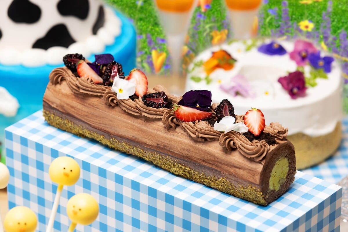 花壇をイメージして、チョコレートとピスタチオを2色使いした「ピスタチオクリームのガーデンロール」