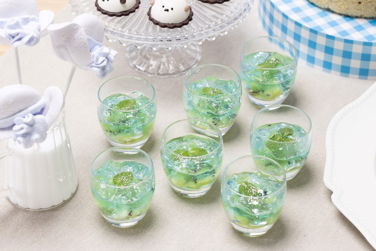 快晴の夏空と草原をイメージした、キウイの果肉入りサイダーゼリー。
