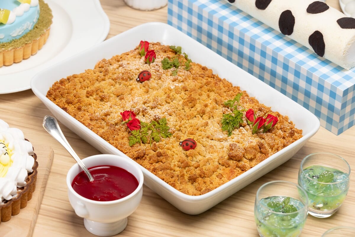 シナモンが入ったりんごのキャラメル煮に、サクサク食感のダージリンクランブルを敷き詰め、じっくり焼き上げたスコップケーキ。