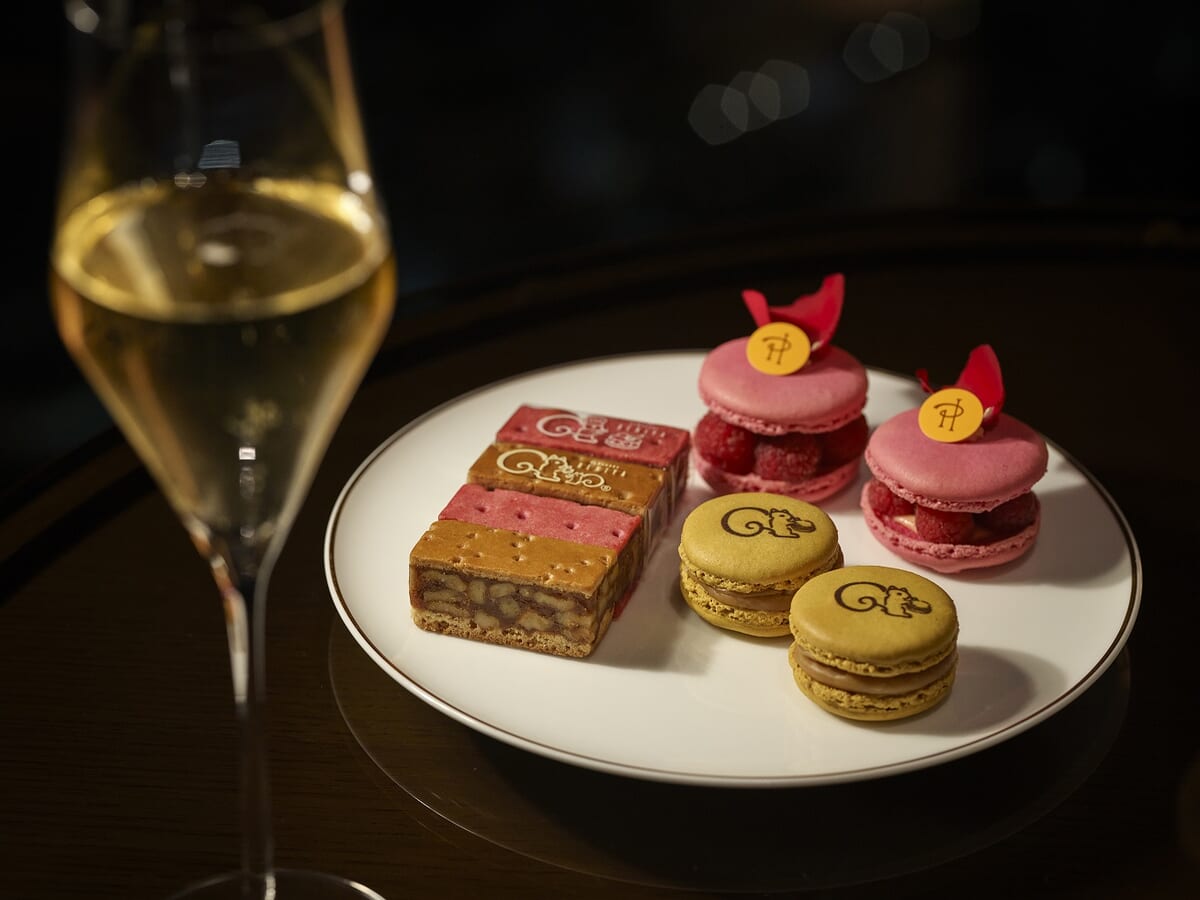 「アフタヌーンティー with 鎌倉紅谷 & ピエール・エルメ・パリ」のスイーツと、お酒に合わせた軽やかなセイボリーを組み合わせた内容です。