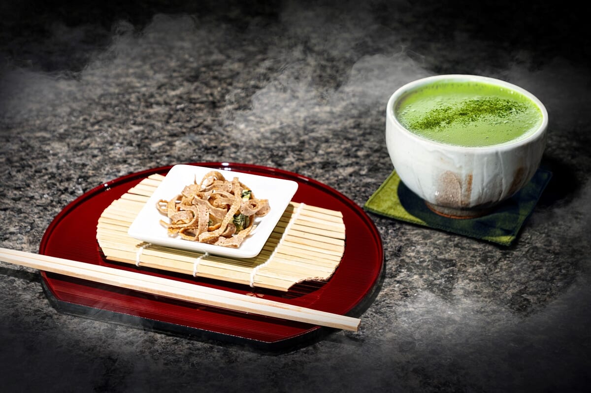 香ばしく焼いたそば粉のクレープを細かく刻み、本物のおそばのような見た目に。
