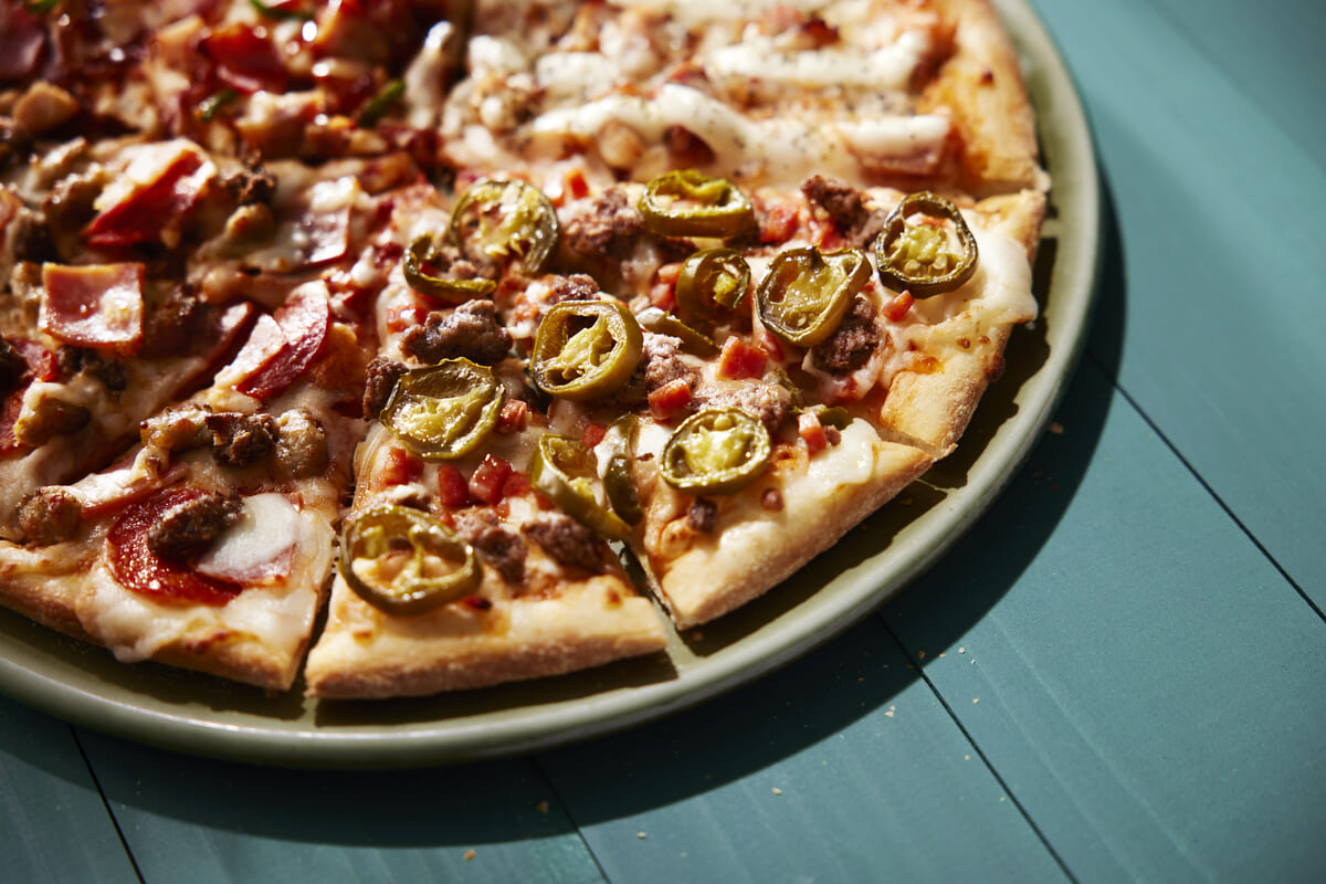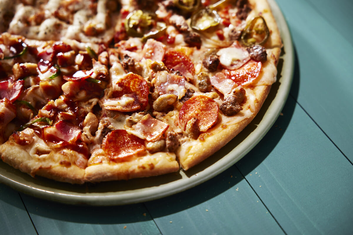 ペパロニ、ハム、イタリアンソーセージ、ビーフパティの4種のミートトッピングを惜しげもなく使用し、さらにエキストラチーズを加えた、肉好きにはたまらない豪快な一枚です。