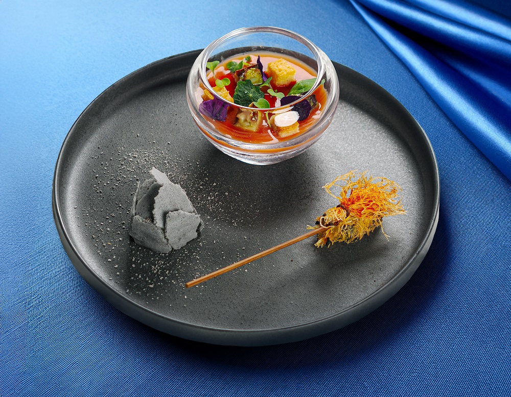 ランチの前菜は「優しさの贈り物」をテーマに「気仙沼産鰹と茄子のアンサンブル」を提供。