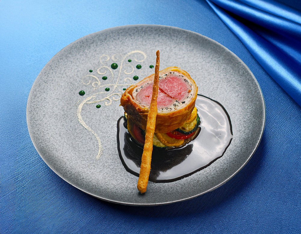 しっとり焼き上げた子羊にレモンバームを忍ばせ、キノコ入りのチキンムースで包んで香ばしいパイ生地を重ねた、手間を惜しまない逸品です!
