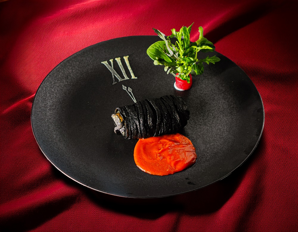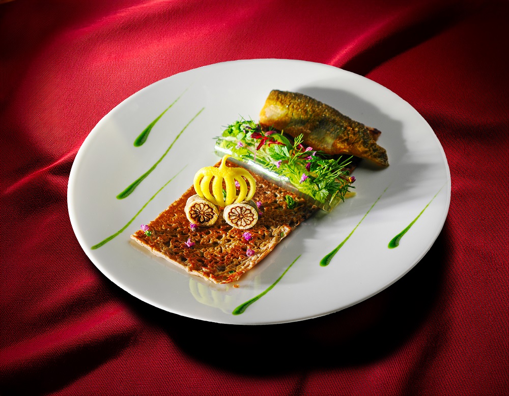竹炭で色づけしたジャガイモをパスタ状にカットしてまとわせた羽太が、香ばしく焼き上げられています。